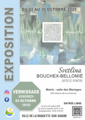 L’exposition se déroule tous le mois d’octobre 2025 dans la salle de la mairie de la Roquette sur Siagne, 630 chemin de la commune 06550. Du lundi au vendredi de 8h à 16h.