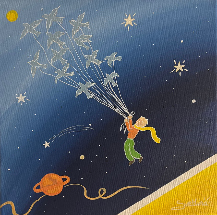Porté par un bouquet d’oiseaux migrateurs, le Prince du ciel s’arrache à la gravité de son astéroïde pour explorer d’autres mondes. Ce geste audacieux symbolise l’adieu nécessaire, la libération et la quête constante de sens à travers le voyage. L’Envol est une ode à la liberté.